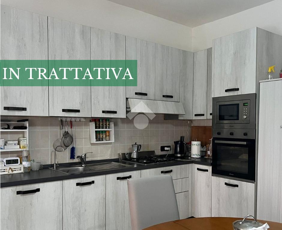 Dal cortile comune accediamo all'appartamento dove ci accoglie la zona giorno composta da un luminoso soggiorno con angolo cottura.